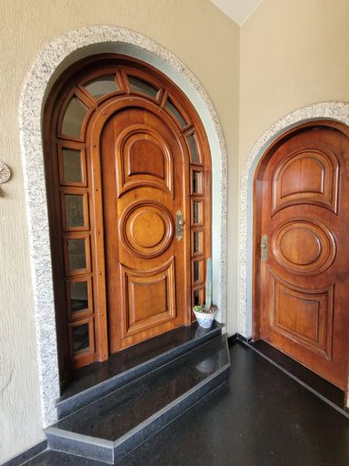 ESQUADRIAS EM MADEIRA DE MOGNO, VIGAMENTO E FORRO DO MEZANINO EM MADEIRA IPÊ TABACO.